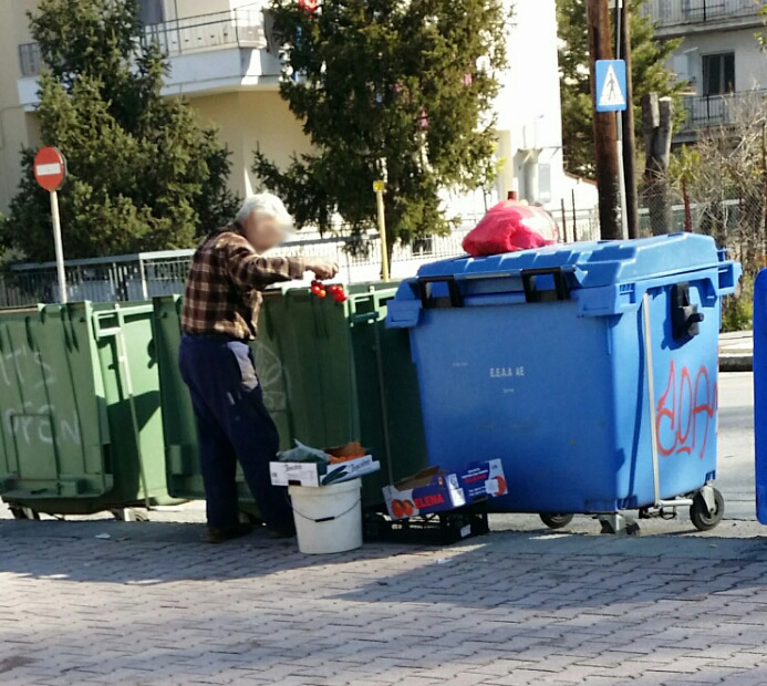 Ένα γεροντάκι (… όχι επαίτης, όχι τσιγγάνος) ψάχνει στα σκουπίδια για φαγητό.