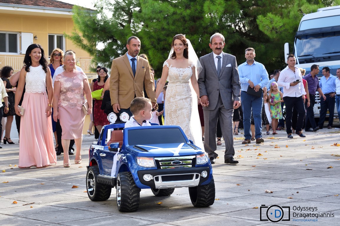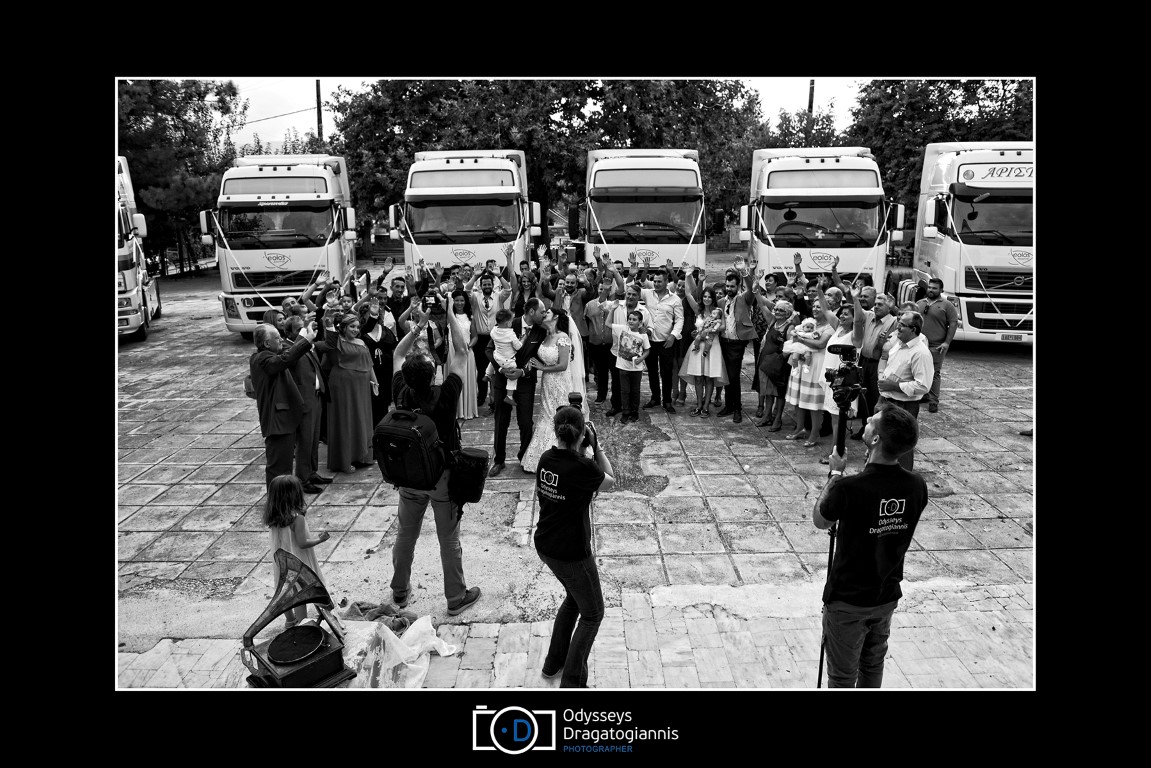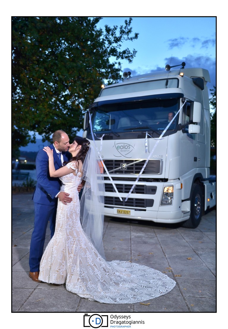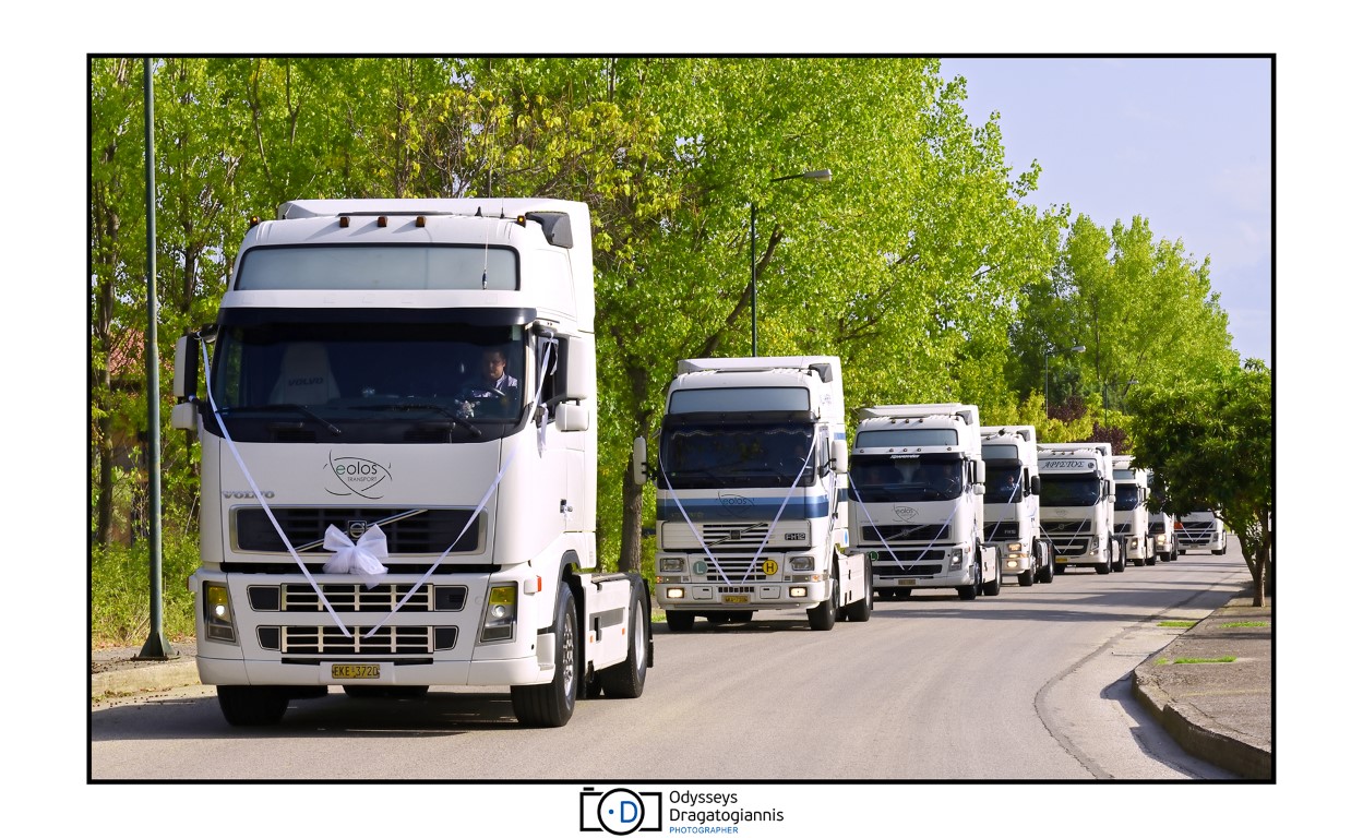 Οι συνάδελφοι του Γιάννη Κουτσή… αναστάτωσαν τη πόλη συνοδεύοντας με τις νταλίκες τους αυτόν και την εκλεκτή της καρδιάς του Ιωάννα Στούμπου, μέχρι τον Ιερό Ναό Αγίας Παρασκευής Ριζώματος, όπου και τελέστηκε το Ιερό Μυστήριο. Η Ελένη Λατσάρα και ο Αθανάσιος Ζησόπουλος τους «ένωσαν» ενώπιον Θεού και ανθρώπων.