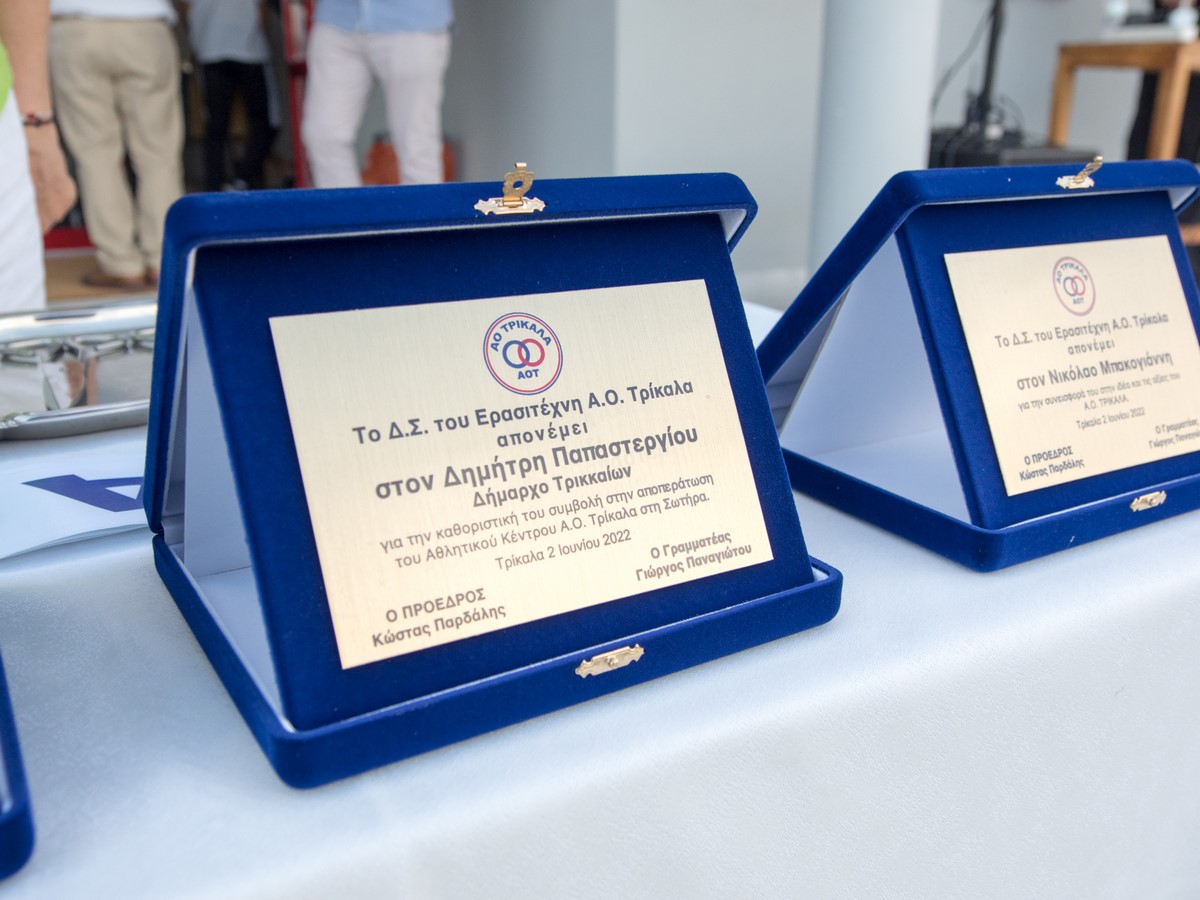 Απονεμήθηκαν τιμητικές πλακέτες στον Περιφερειάρχη Θεσσαλίας κ. Κώστα Αγοραστό, τον Αντιπεριφερειάρχη της ΠΕ Τρικάλων κ. Χρήστο Μιχαλάκη και τον Δήμαρχο Τρικκαίων κ. Δημήτρη Παπαστεργίου, για την μεγάλη τους συμβολή στην ολοκλήρωση του έργου, το οποίο ήταν ένα όνειρο 59 ετών, να αποκτήσει ο ΑΟ Τρίκαλα τις δικές του εγκαταστάσεις. Και έγινε πραγματικότητα, κάτι που έχει χαροποιήσει όλους τους υγιείς Τρικαλινούς φιλάθλους.
