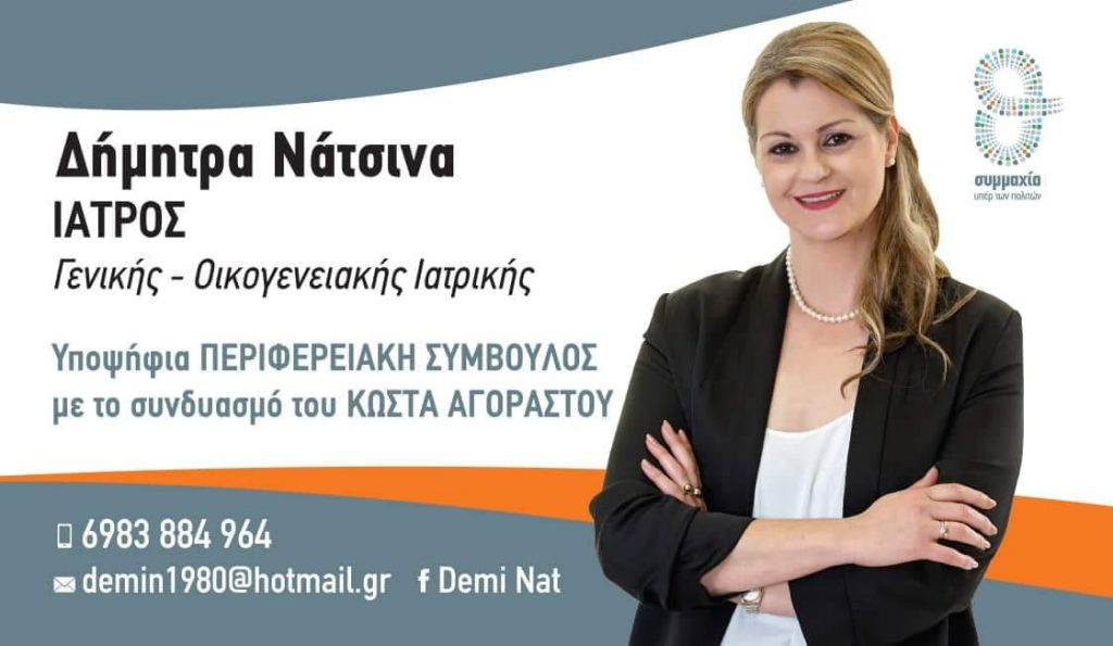 Για πότε έκλεισε πως κατεβαίνει υποψήφια περιφερειακή σύμβουλος στα Τρίκαλα με τον Αγοραστό, για πότε κινητοποίησε όλες τις δυνάμεις της (συναδέλφους ιατρούς, φίλους, συνεργάτες), για πότε… έβγαλε και την κάρτα της, ούτε που το καταλάβαμε!!!… Ο λόγος περί της ιατρού Δήμητρας Νάτσινα η οποία έκλεισε με τον περιφερειάρχη το περασμένο Σάββατο και ήδη ξεκίνησε αγώνα (… δυνατό). Διεκδικεί με μεγάλες αξιώσεις μια έδρα στο επόμενο Περιφερειακό Συμβούλιο και είναι αποφασισμένη να την κερδίσει. Αξίζει, οπότε…