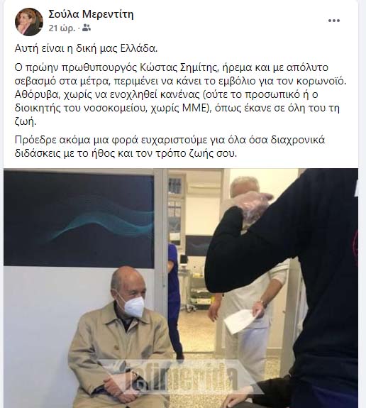 Εμβολιάστηκε, με τη σειρά του, περιμένοντας στον προθάλαμο με τους συνομηλίκους του ο Κώστας Σημίτης και η φωτογραφία του κυκλοφόρησε χθες σε πολλά μέσα ενημέρωσης.