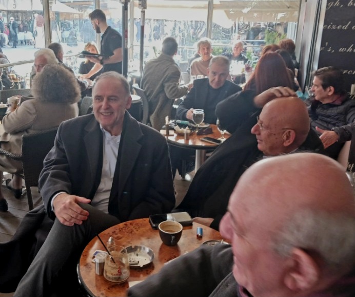 Έτσι λίαν πρωίαν της Δευτέρας εθεάθη για καφέ με τον αδελφικό του φίλο Φώτη Χώτο που κέρναγε για την γιορτή του. Αισιόδοξος είναι ο Sir ότι… όλα θα πάνε καλά.