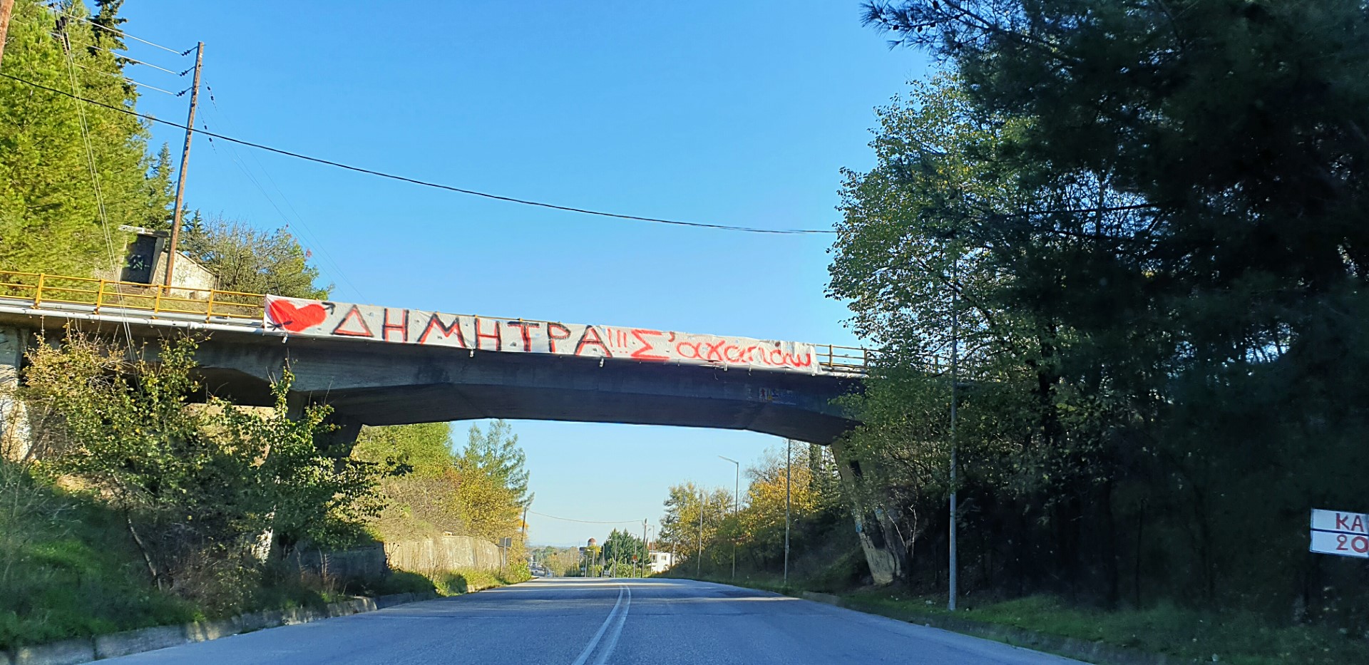 Έρωτας… στα κάγκελα, κυριολεκτικά, στην πόλη των Τρικάλων. Ερωτοχτυπημένος νέος (… μάλλον) κρέμασε στην αερογέφυρα του περιφερειακού της πόλης απ’ όπου διέρχονται εκατοντάδες (… έως χιλιάδες) αυτοκίνητα καθημερινά ένα γιγαντιαίο πανό αφιερωμένο στην αγάπη του.