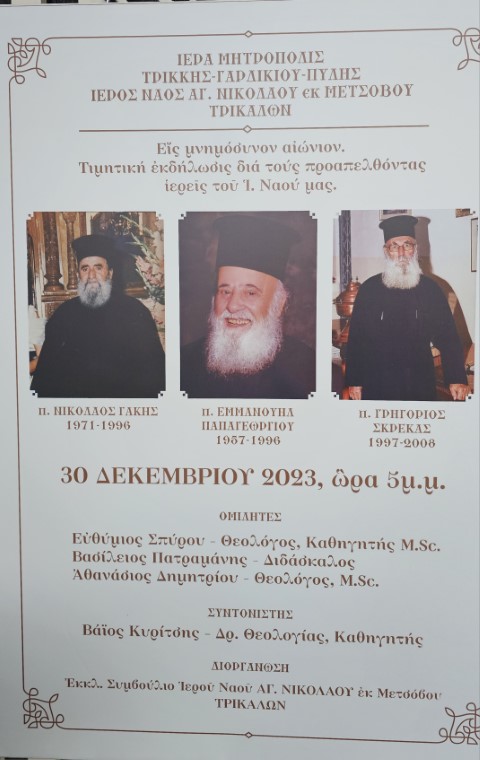 Εις μνημόσυνο αιώνιο, ο πατέρας Δημήτριος Κυρίτσης, εφημέριος του Ιερού Ναού Αγίου Νικολάου εκ Μετσόβου και ακάματος εργάτης του Ευαγγελίου τιμά σε ειδική εκδήλωση το Σάββατο 30 Δεκεμβρίου στις 5 μ.μ. τους προκατόχους του ιερείς και εφημερίους.