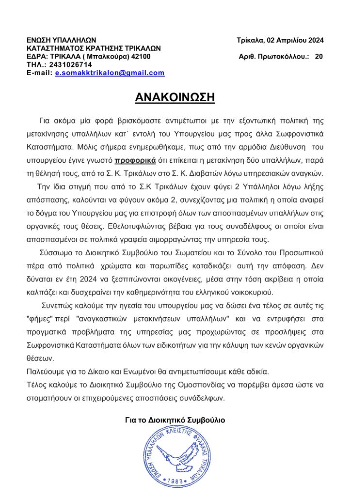 Την έντονη διαμαρτυρία της Ένωσης Υπαλλήλων Φυλακών Τρικάλων προκαλεί νέα μετακίνηση μελών της από τα Τρίκαλα σε άλλες φυλακές της χώρας.