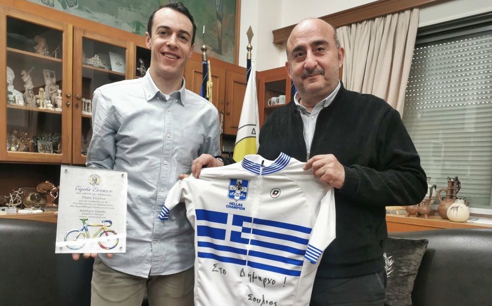 Στο Δημαρχείο Τρικκαίων ο κ. Σακκάς παρέδωσε ένα αναμνηστικό για τις μεγάλες επιτυχίες του τρικαλινού αθλητή και το 2023, χρονιά κατά την οποία αναδείχθηκε πρωταθλητής Ελλάδος σε τρία αγωνίσματα στο Πανελλήνιο Πρωτάθλημα Πίστας (elimination, scratch, Omnium), αλλά και πρωτιές και μετάλλια στο Βαλκανικό Πρωτάθλημα Πίστας (χρυσό στο elimination, ασημένιο στο Scratch και χάλκινο μετάλλιο στο Omnium). Ο κ. Σακκάς τόνισε τη σημασία του αθλητισμού γενικότερα, τις προσπάθειες που κάνει ο Δήμος Τρικκαίων να ενισχύσει περισσότερες τις αθλητικές υποδομές και τη σημαντική ανάδειξη νέων τρικαλινών πρωταθλητών, που συνεχίζουν τη μακρά παράδοση σε μια πόλη του αθλητισμού και του ποδηλάτου ειδικότερα.