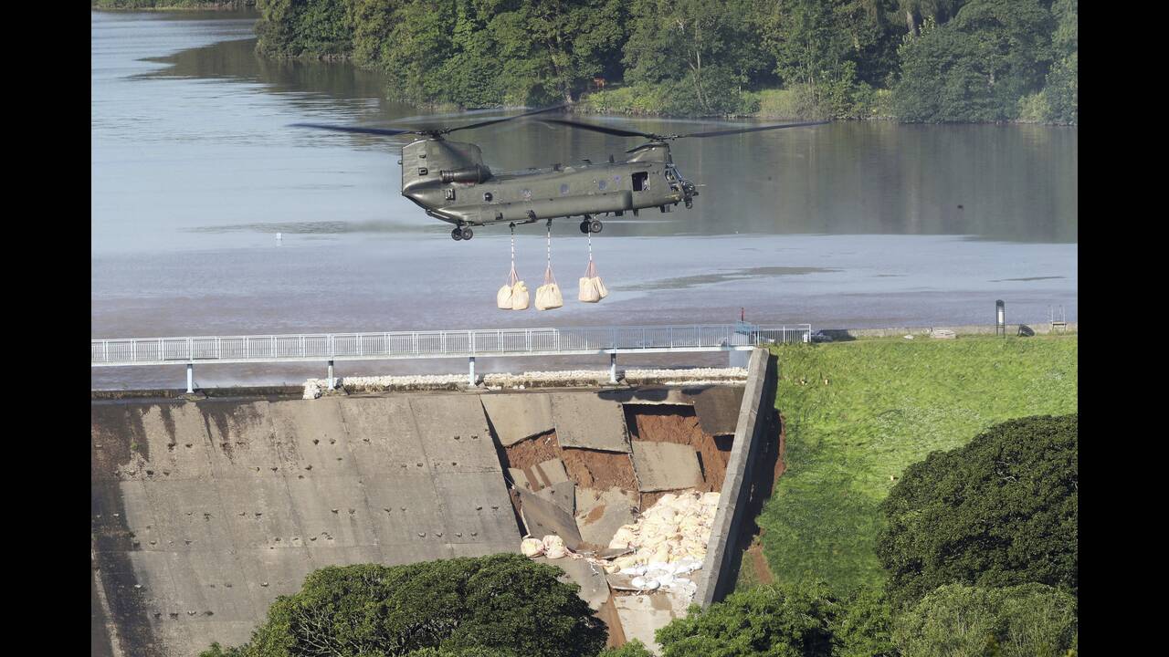 Ελικόπτερο του βρετανικού στρατού ρίχνει σακιά για να ανακόψει την ξέφρενη πορεία του νερού που συγκρατούσε το φράγμα.