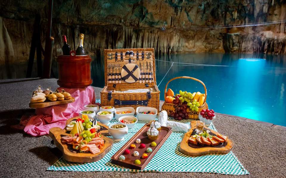 Μετά την περιήγηση μπορούν να απολαύσουν μια βουτιά στα κρυστάλλινα νερά του σπηλαίου, ώστε να ανοίξει η όρεξη και να καθίσουν για ένα γκουρμέ γεύμα τριών πιάτων που ετοιμάζει ο Γάλλος αρχιμάγειρας των Velas Resorts, Michel Mustiere.