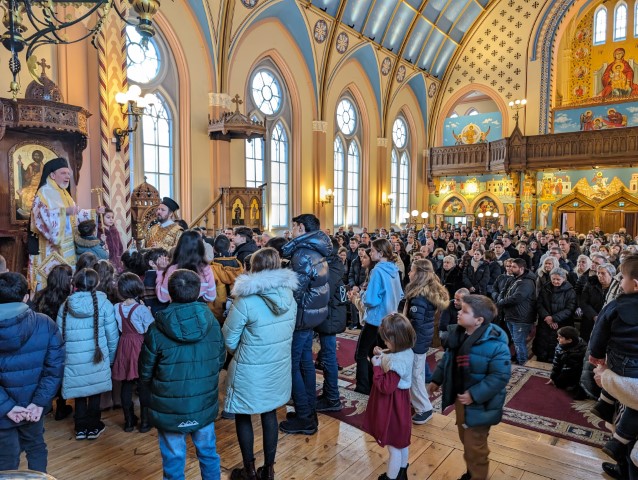 Την παραμονή της εορτής των Θεοφανείων, Παρασκευή, 5 Ιανουαρίου 2024, με την θερμοκρασία να αγγίζει τους -11°C, τελέστηκε στον Καθεδρικό Ναό του Αγίου Γεωργίου Στοκχόλμης, η ακολουθία του εσπερινού της εορτής και εν συνεχεία η Θεία Λειτουργία του Μεγάλου Βασιλείου, χοροστατούντος του Σεβ. Μητροπολίτου Σουηδίας και πάσης Σκανδιναυΐας κ. Κλεόπα, ο οποίος ετέλεσε και την ακολουθία του Μεγάλου Αγιασμού.