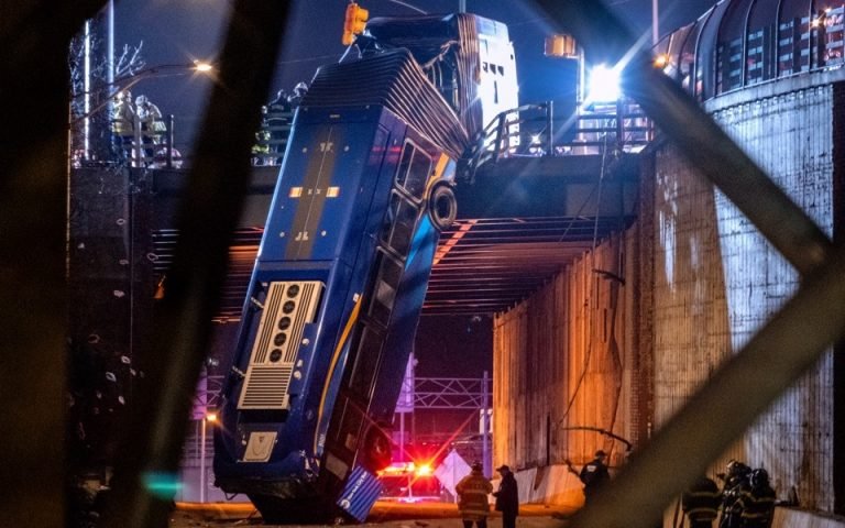 Το αστικό λεωφορείο έσπασε τη μπαριέρα της γέφυρας και έμεινε να κρέμεται πάνω από τον δρόμο που περνά από κάτω ώσπου δέθηκε από την πυροσβεστική υπηρεσία της Νέας Υόρκης για να απομακρυνθεί.