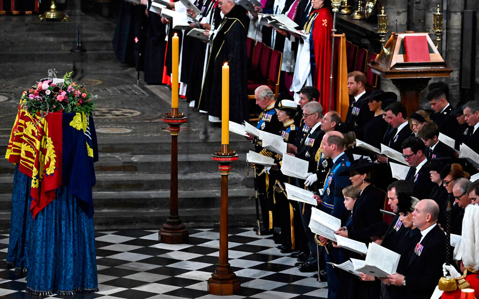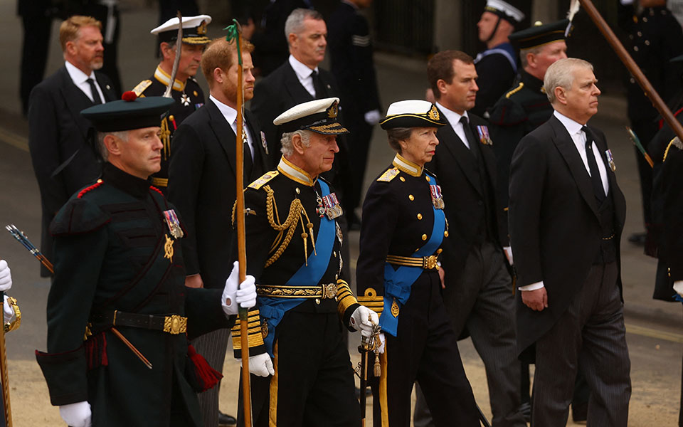 Οι κοντινότεροι συγγενείς της βασίλισσας Ελισάβετ Β’ –με πρόσωπα χλωμά και σοβαρά– ακολούθησαν το φέρετρό της προς το Αββαείο του Γουέστμινστερ όπου πραγματοποιήθηκε η κηδεία της, με μια προσεκτικά χορογραφημένη πομπή.