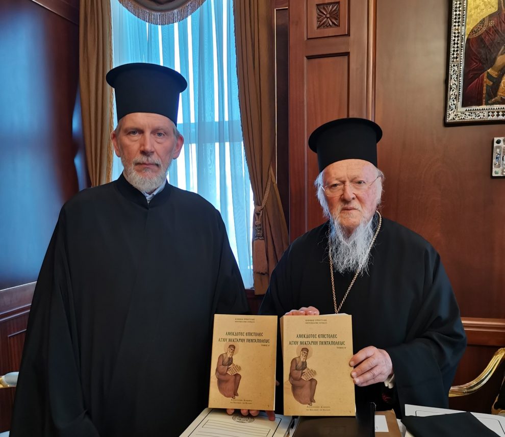 Ο Σεβ. Μητροπολίτης Σουηδίας και πάσης Σκανδιναυΐας κ. Κλεόπας, προσκληθείς υπό της Α. Θ. Παναγιότητος, του Οικουμενικού Πατριάρχου κ.κ. Βαρθολομαίου, προκειμένου να συμμετάσχει και με άλλους Ιεράρχες στην επέτειο των εορτασμών της συμπληρώσεως 32 ετών από της εκλογής της Σεπτής Κορυφής στον Πρώτο Θρόνο της υπ’ ουρανόν Ορθοδοξίας, με την ευκαιρία αυτή, επέδωσε στον Παναγιώτατο το άρτι εκδοθέν δίτομο έργο του με τίτλο: «Ανέκδοτες Επιστολές Αγίου Νεκταρίου Πενταπόλεως».