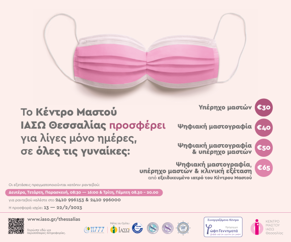 Το Κέντρο Μαστού ΙΑΣΩ Θεσσαλίας προσφέρει για λίγες μόνο ημέρες, σε όλες τις γυναίκες, προληπτικές εξετάσεις σε εξαιρετικά προνομιακές τιμές.