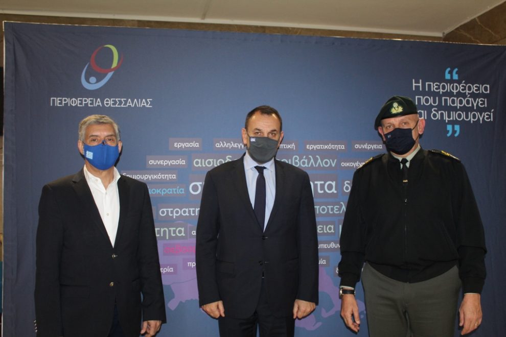 Ο Υπουργός Εθνικής Άμυνας Νίκος Παναγιωτόπουλος, συνοδευόμενος από τον Αρχηγό ΓΕΕΘΑ στρατηγό Κωνσταντίνο Φλώρο και τον Αρχηγό Τακτικής Αεροπορίας Αντιπτέραρχο Θεμιστοκλή Μπουρολιά επισκέφτηκε σήμερα τον Περιφερειάρχη Θεσσαλίας Κώστα Αγοραστό και ενημερώθηκε για το ολοκληρωμένο σχέδιο και την πορεία διαχείρισης των συνεπειών του σεισμού που έπληξε την περιοχή.