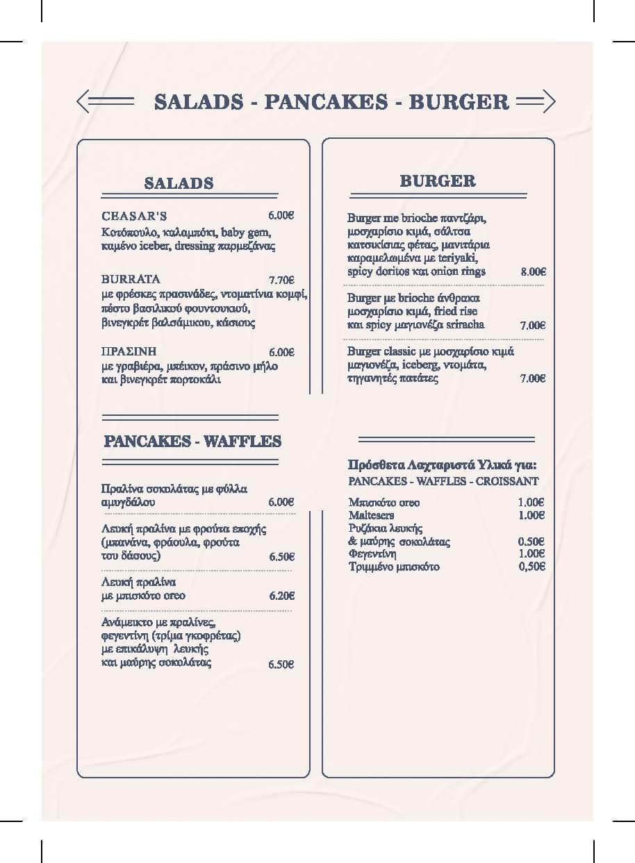 Εκεί δοκιμάσαμε τα πιο νόστιμα burgers της πόλης, εκεί ξεκινήσαμε τη μέρα μας με ομελέτες και τηγανιτά αυγά που παραπέμπουν στο “πρωινό της μαμάς”, εκεί συνεχίσαμε για brunch και πήραμε εκπληκτικές μπαγκέτες στο χέρι, εκεί δροσιστήκαμε τα μεσημέρια με τις ολόφρεσκες σαλάτες τους, εκεί αργά το απόγευμα καταλήξαμε για μακαρονάδα με κιμά (… όπως πρέπει να είναι!!!) και μπόλικο τριμμένο τυρί από πάνω. Δείτε τον κατάλογο, δείτε και τις φωτογραφίες και θα καταλάβετε τι εννοούμε: