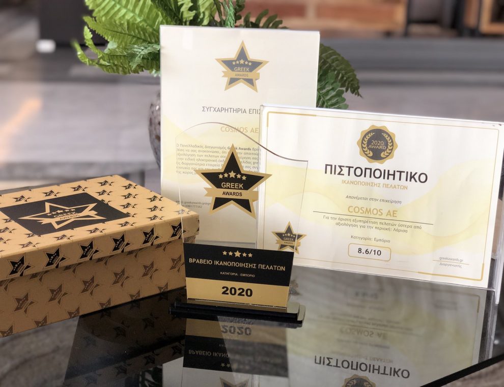 Με το Βραβείο Ικανοποίησης Πελατών 2020 των Greek Awards τιμήθηκε το κατάστημα οικιακού εξοπλισμού Cosmos A.Ε επιβεβαιώνοντας την προσήλωση της εταιρείας στην προσφορά ολοκληρωμένων υπηρεσιών πώλησης με έμφαση στον πελάτη και στις ανάγκες του. Σε αυτό το πλαίσιο το κατάστημα Cosmos προσφέρει τη δυνατότητα εξατομικευμένης συμβουλευτικής από έμπειρους interior designers, υπηρεσία παράδοσης της παραγγελίας σας στον χώρο σας, υπηρεσία συναρμολόγησης καθώς και after sales υπηρεσίες. Όλα μας τα προϊόντα ξεχωρίζουν για τον απαράμιλλο σχεδιασμό και την ποιότητα των υλικών τους, ενώ τα περισσότερα από αυτά προσαρμόζονται στις απαιτήσεις κάθε πελάτη στον ελάχιστο χρόνο παράδοσης.
