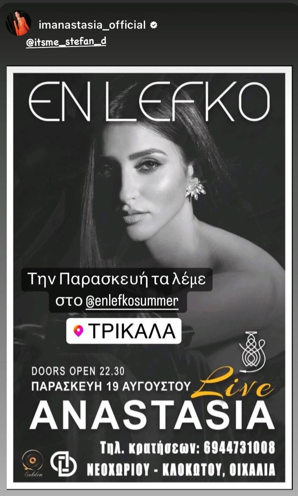 Στο EN LEFKO στην Οιχαλία, το οποίο έχει κλέψει την παράσταση στη διασκέδαση το φετινό καλοκαίρι, θα εμφανιστεί την Παρασκευή η ANASTASIA.