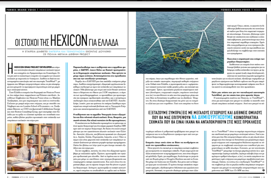 Το Forbes αναφέρεται αναλυτικά στην τεχνολογική καινοτομία της Hexicon που είναι εισηγμένη στο χρηματιστήριο της Στοκχόλμης, αλλά και στον κ. Μικέλη Χατζηγάκη ως ένα ικανό στέλεχος με μακρά εμπειρία στην ενέργεια όπου θήτευσε σε θέσεις κλειδιά ως COO στην Βρετανική Cobblestone Energy και στην Boston Consulting Group πριν επιστρέψει στην Ελλάδα για να τρέξει το Ελληνικό πρότζεκτ της Σουηδικής εταιρείας καθώς βλέπει μεγάλες προοπτικές στην ανάπτυξη των υπεράκτιων αιολικών την χώρα μας.