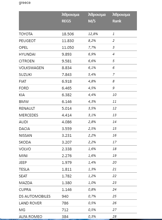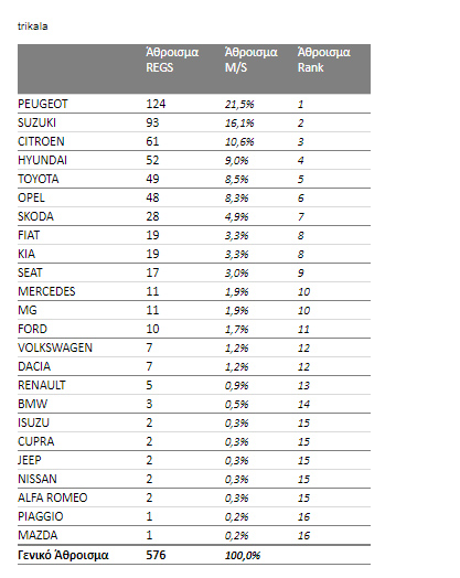 Σύμφωνα με τα επίσημα στοιχεία του Συνδέσμου Εισαγωγέων Αντιπροσώπων Αυτοκινήτων που έχει στη διάθεσή του το trikalavoice.gr και την περασμένη χρονιά στα Τρίκαλα πρωταθλήτρια αναδείχθηκε η PEUGEOT η οποία πούλησε 124 αυτοκίνητα, ακολούθησε η SUZUKI με 93 και η SEAT με 61.