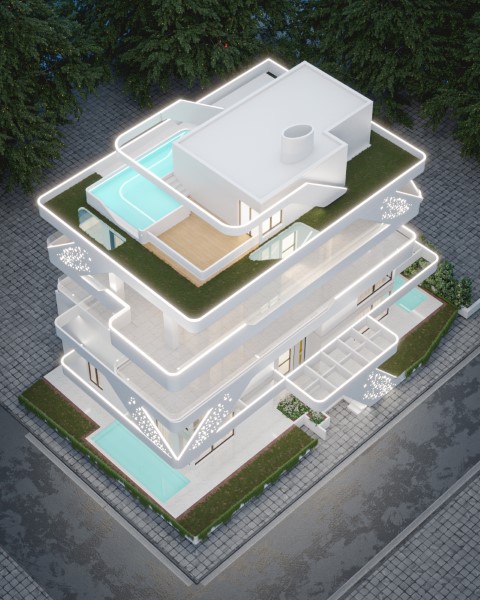 Πρόκειται για κτίριο δομημένο σε τέσσερα επίπεδα. Στα δυο πρώτα επίπεδα και σε συνέχεια με χώρο πρασίνου και πισίνα βρίσκονται οι δυο εντυπωσιακές μεζονέτες, ενώ στους δύο τελευταίους ορόφους τα οροφοδιαμερίσματα, με τον τελευταίο όροφο να είναι σε άμεση επαφή με μικρό loft με πισίνα και φυτεμένο δώμα.