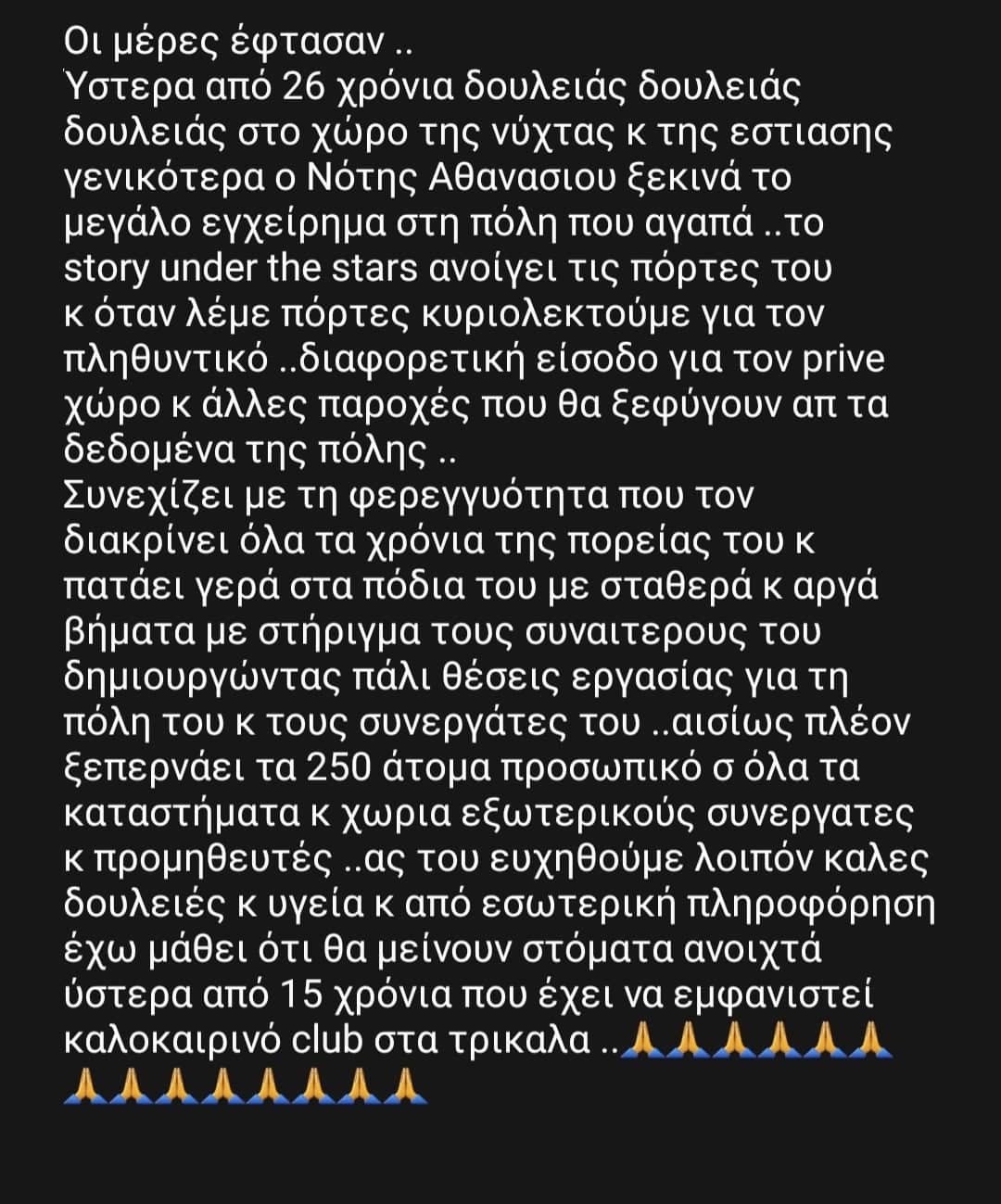 Μιλάμε για το STORY under the stars, στο 4ο χλμ. Τρικάλων-Καλαμπάκας, το οποίο φέρνει νέα δεδομένα στην πόλη, ανεβάζοντας πολλά επίπεδα τη διασκέδαση. Σε έναν απίστευτο χώρο που παραπέμπει σε μεγάλα club των Αθηνών ή και της Μυκόνου, με lounge, πριβέ σαλόνια και εισόδους και ένα πακέτο υπηρεσιών που θα μας κάνουν πραγματικά να απολαύσουμε τις… Ιστορίες μας κάτω από τα αστέρια. Το μεγάλο OPENNING έχει προγραμματιστεί και θα γίνει αύριο Σάββατο 25 Ιουνίου. Είμαστε έτοιμοι να ζήσουμε την εμπειρία. Δείτε ΕΔΩ εικόνες από το νέο club και παρακάτω το βίντεο-πρόσκληση των εγκαινίων, αλλά και το μήνυμα της ομάδας του Νότη Αθανασίου: