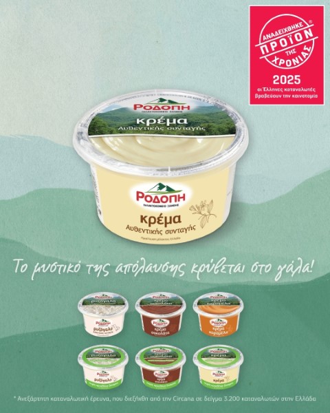 Με ιδιαίτερη χαρά ανακοινώνουμε ότι τα επιδόρπια γάλακτος ΡΟΔΟΠΗ αναδείχθηκαν «Προϊόν της Χρονιάς 2025». Η αξιολόγηση πραγματοποιήθηκε από την Circana, κορυφαία εταιρεία στον κλάδο των μετρήσεων αγοράς, μέσα από έρευνα σε αντιπροσωπευτικό κοινό 3.200 Ελλήνων καταναλωτών.
