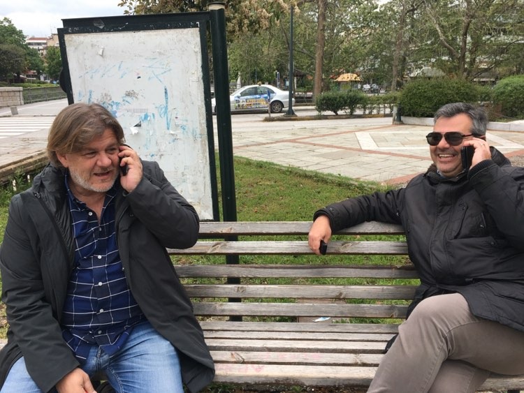 Διακρίνονται ο επιτελάρχης της Νομαρχίας (… και μέγας μάγειρας) Γιώργος Καρανάσιος, με τον Γιώργο Δουλόπουλο, ιδιοκτήτη της πάλαι ποτέ μικράς Βουλής του ALVEO, να ξεροσταλιάζουν φασκιωμένοι σε ένα παλιοπαγκάκι στην πλατεία Ρήγα Φερραίου…