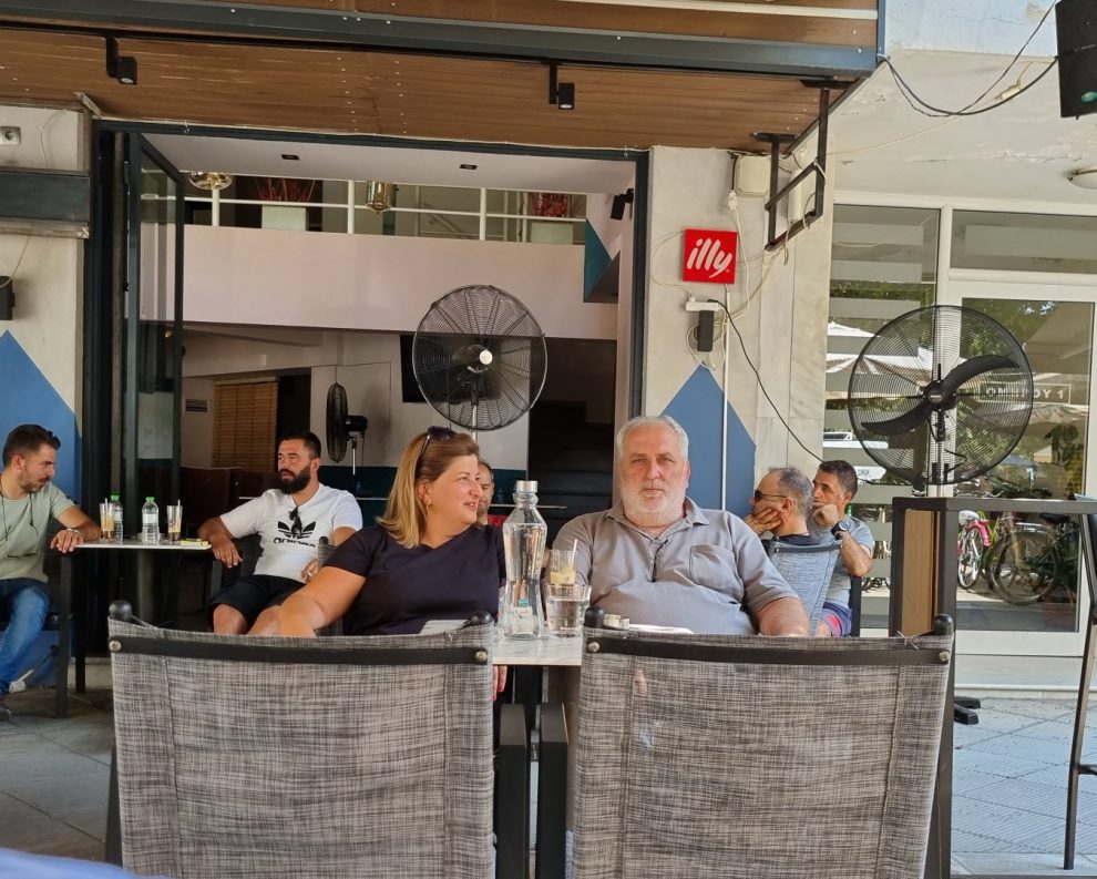 Κι ενώ όλοι περιμέναμε να αποσυρθούμε στη δροσιά του air condition για το απομεσήμερο η Ευαγγελία Σωτηρίου βρήκε κουράγια, λίγο πριν αναχωρήσει για τις καλοκαιρινές της διακοπές, να σφίξει μια πολιτική ανάλυση με τον σύντροφο Σταύρο Νταούλα, ηγέτη του τοπικού ΣΥΡΙΖΑ, κάτω απ’ τα πλατάνια…