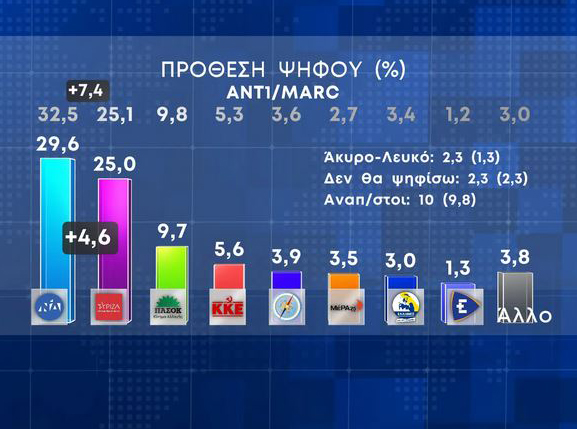 Στην πρόθεση ψήφου, η Νέα Δημοκρατία συγκεντρώνει το 29,6% και ακολουθεί ο ΣΥΡΙΖΑ με 25%.