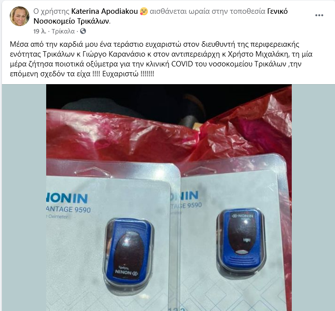 Διακριτικά στο πλευρό του όλα τα χρόνια, προσέφερε και προσφέρει σε πολλές περιπτώσεις ανιδιοτελώς σε ανθρώπους που έχουν ανάγκη, πιστή στον Όρκο της. Για τον εαυτό της δε ζητάει ποτέ, ούτε “εκμεταλλεύεται” τη θέση του συζύγου της. Μόνο όταν… πρέπει. Όπως τούτη τη φορά που διαπίστωσε ελλείψεις στο Νοσοκομείο όπου προσφέρει ανιδιοτελώς επίσης τις υπηρεσίες της, στη μάχη με τον covid-19. Ζήτησε από Μιχαλάκη και Καρανάσιο οξύμετρα και σε χρόνο… dt, το αίτημα ικανοποιήθηκε!… Ιδού και το ευχαριστήριο…