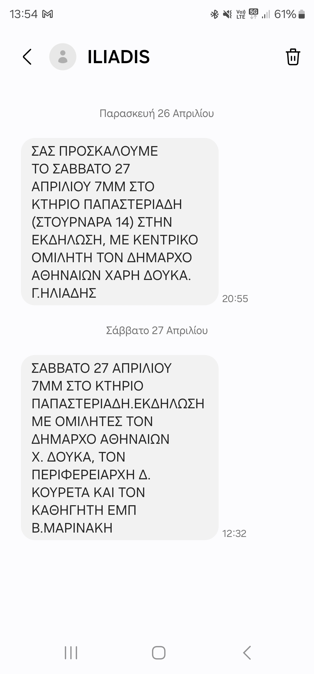 Επισήμως μάλιστα δεν δόθηκε καμία ερμηνεία από το γραφείο του και μοιραία τροφοδοτήθηκαν περαιτέρω οι παραπολιτικές ερμηνείες. Επικρατέστερη αυτών η αποστολή ενός αυτοματοποιημένου μηνύματος-πρόσκληση από τον Ηλιάδη που ανέφερε μόνο τον δήμαρχο Αθηναίων Χάρη Δούκα ως ομιλητή. Το λάθος διορθώθηκε μερικές ώρες αργότερα, το πρωί του Σαββάτου αλλά… φευ. Ήταν ήδη αργά και ο περιφερειάρχης ένιωθε ήδη προσβεβλημένος. Τα sms είναι αυτά που σας παρουσιάζει το trikalavoice.gr παρακάτω: