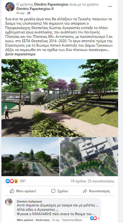 Εκεί που πάμε να τους ηρεμήσουμε Αγοραστό, Παπαστεργίου, Μιχαλάκη… τσουπ, νάτο το σχολιάκι!!!… Ο στενός συνεργάτης του δημάρχου Δημήτρη Παπαστεργίου, μα και… στενός φίλος του Χρήστου Μιχαλάκη (πρώτα) και του Κώστα Αγοραστού, αναστατώνει με το σχόλιο που έγραψε κάτω από την ανάρτηση του δημάρχου Τρικκαίων για την ανάπλαση των πλατειών της πόλης (τις οποίες χρηματοδοτεί και για τις οποίες υπέγραψε ο Αγοραστός χθες).