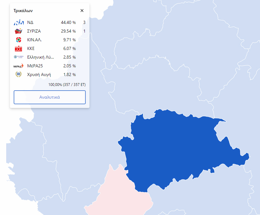 Υπενθυμίζεται ότι το 2019 η Ν.Δ. είχε λάβει 44.40% στα Τρίκαλα (… μοιάζει με όνειρο μακρινό), ο ΣΥΡΙΖΑ 29.54% και το ΠΑΣΟΚ 9.71%.