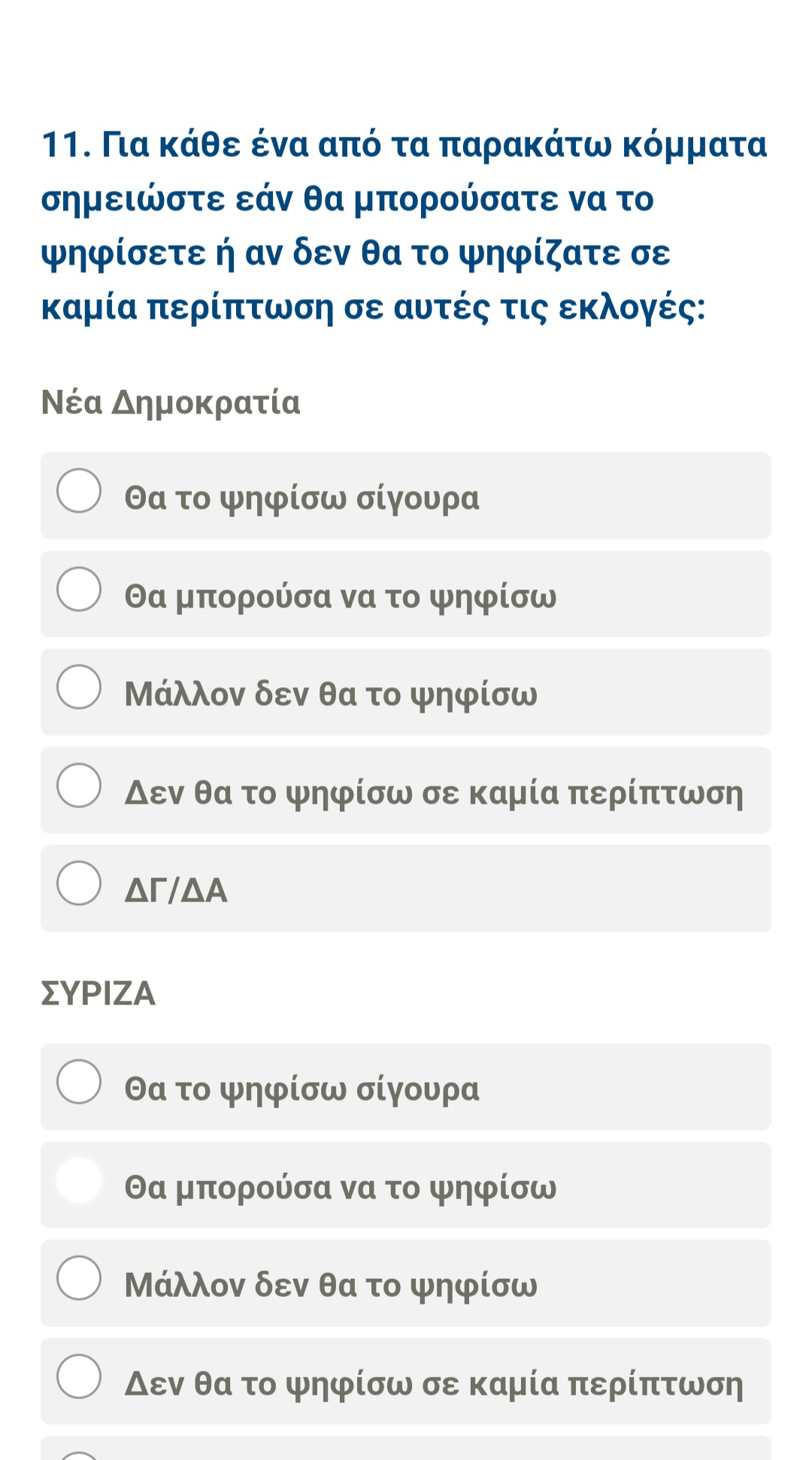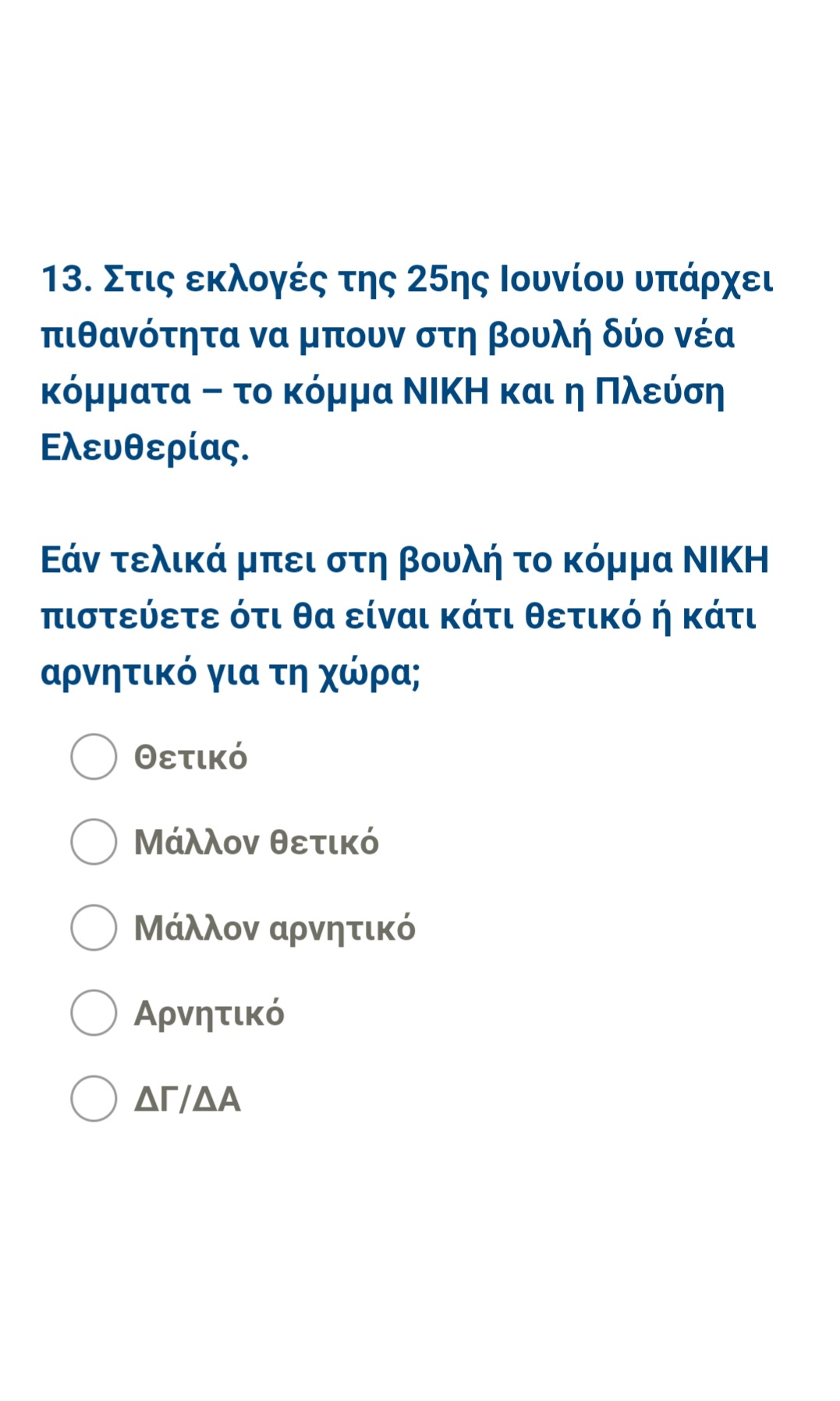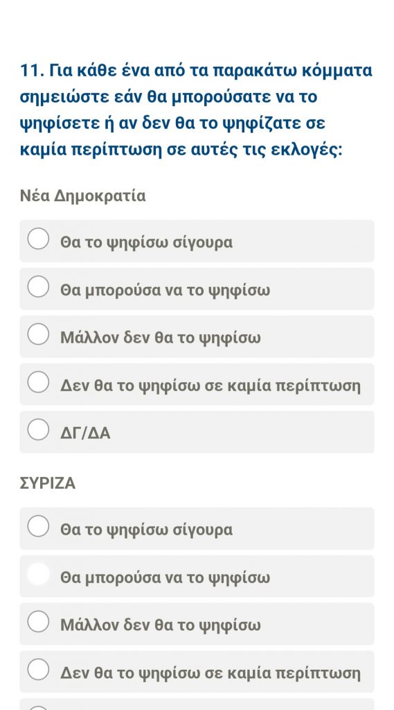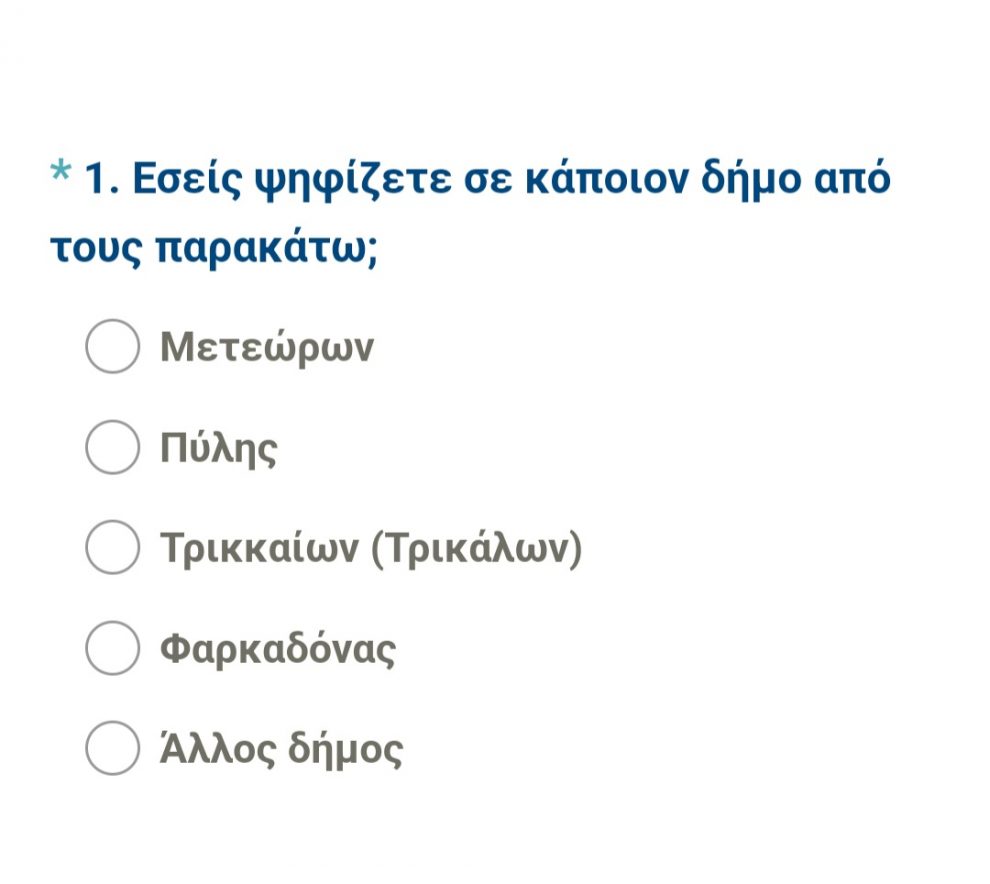 Όπως καταγράφει το trikalavoice.gr το πρώτο ερώτημα που τίθεται είναι σε ποιον Δήμο ψηφίζει ο αναγνώστης, έπειτα δημογραφικά στοιχεία και στη συνέχεια ποιο κόμμα θα ψηφίσουν, ποιο… δεν θα ψήφιζαν (!!!) και πόσο πιθανό θεωρούν τον σχηματισμό αυτοδύναμης Κυβέρνησης: