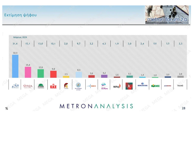 Δημοσκόπηση Metron Analysis: Στο 32,3% ανέβηκε η ΝΔ, στο 15,4% ο ΣΥΡΙΖΑ, νέα πτώση για το ΠΑΣΟΚ