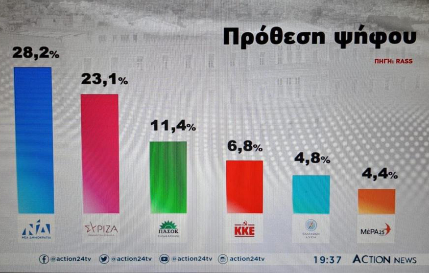 Η πανελλήνια έρευνα της RASS, που πραγματοποιήθηκε μετά την ανακοίνωση της ημερομηνίας διεξαγωγής των εκλογών από τον Πρωθυπουργό Κυριάκο Μητσοτάκη, εμφανίζει τη ΝΔ να συγκεντρώνει ποσοστό 28,2%, τον ΣΥΡΙΖΑ 23,1%, το ΠΑΣΟΚ 11,4%, το ΚΚΕ 6,8%, την Ελληνική λύση 4,8% και το ΜέΡΑ25 4,4%.