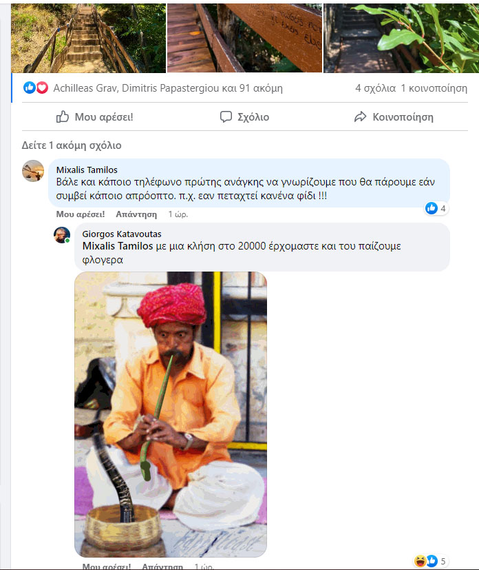 Πάντοτε τον θεωρούσε και ακόμη τον θεωρεί “καθηγητή τοπικής αυτοδιοίκησης”. Συχνά συναντιούνται, τον συμβουλεύεται και τον ακούει. Χθες πάντως τον… τρόλαρε λίγο τον μέντορά του ο Γιώργος ο Καταβούτας. Κάτω από ανάρτησή του για την περιπατητική διαδρομή στο Φρούριο ο Ταμήλος του πρότεινε να βάλει και τηλέφωνα έκτακτης ανάγκης ώστε να μπορεί κάποιος να καλεί αν π.χ. πεταχτεί κανένα φίδι. Ε, ο Καταβούτας απάντησε όπως παρακάτω, δίνοντας τηλεφωνικό αριθμό και λέγοντας πως και… φλογέρα στέλνουν άμα λάχει για να παίξει στο φιδάκι: