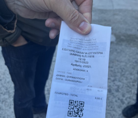 Ωστόσο οι προσευχές του εισακούστηκαν και λίαν πρωίαν Κυριακής οι άνεμοι έπεσαν, τα πλοία έπλευσαν, οι καρδιές μας εσκίρτησαν και ο δήμαρχος επιστρέφει στην πόλη του. Στη φωτογραφία το εισιτήριο που εξασφάλισε με το πλοιάριο των 12.10 μ.μ..