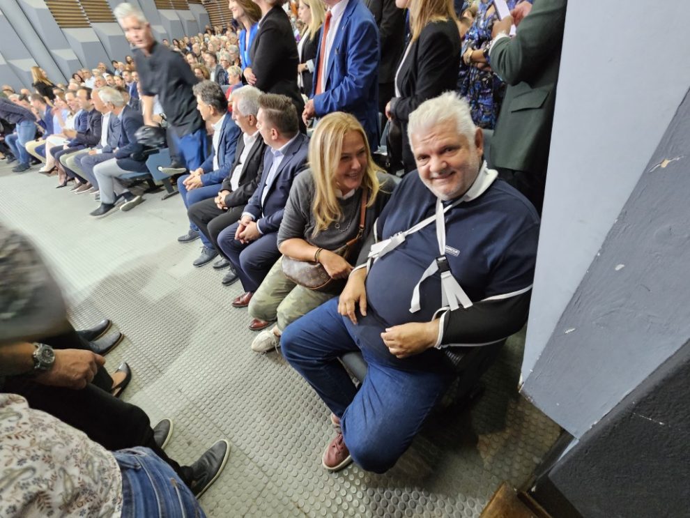 Παρά τους αφόρητους πόνους και με τα χέρια μπαταρισμένα έδωσε το παρών στην εκδήλωση, έχοντας σταθερά δίπλα του τη σύζυγό του Κατερίνα Αποδιάκου. Καταχειροκροτήθηκε από τον κόσμο, ως ένδειξη αναγνώρισης της πορείας του όλα αυτά τα χρόνια…