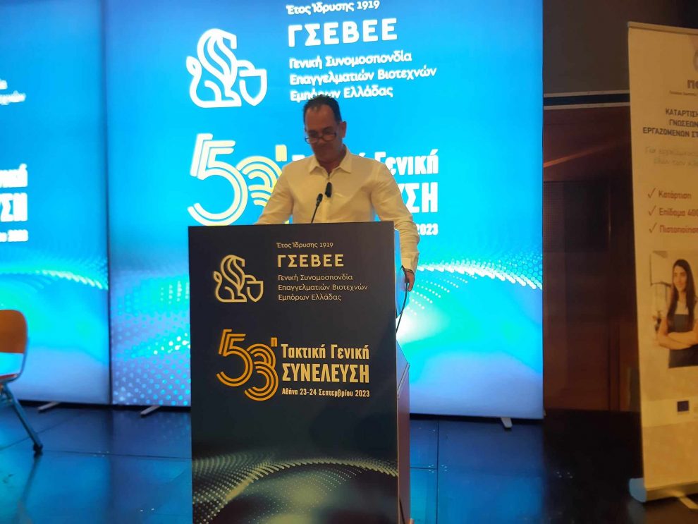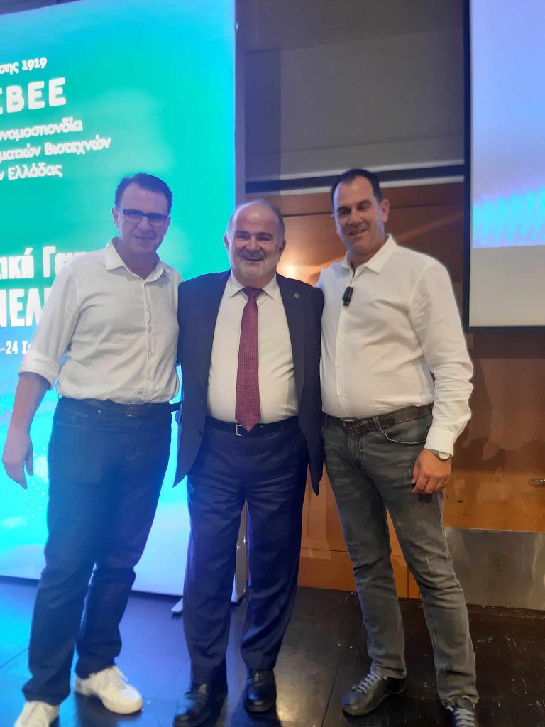 Δίνει αγώνα δυνατό και… πολυεπίπεδο. Στην κάτω φωτό διακρίνεται με τον πρόεδρο της ΓΣΕΒΕΕ Γιώργο Καββαθά και τον αντιπρόεδρο αυτής, πρόεδρο της Ομοσπονδίας ΕΒΕ Τρικάλων Βαγγέλη Αγγελάκη.