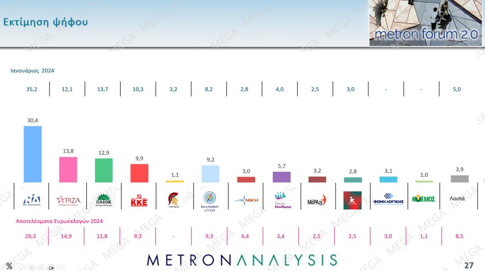 Στην πρόθεση ψήφου, η Ν.Δ. συγκεντρώνει 24,4%, ο ΣΥΡΙΖΑ 11,1%, το ΠΑΣΟΚ 10,3% και ακολουθούν ΚΚΕ, Ελληνική Λύση και Πλεύση Ελευθερίας. Στην εκτίμηση ψήφου, η Ν.Δ. βρίσκεται στο 30,4% και ακολουθούν ΣΥΡΙΖΑ με 13,8% και ΠΑΣΟΚ με 12,9%.
