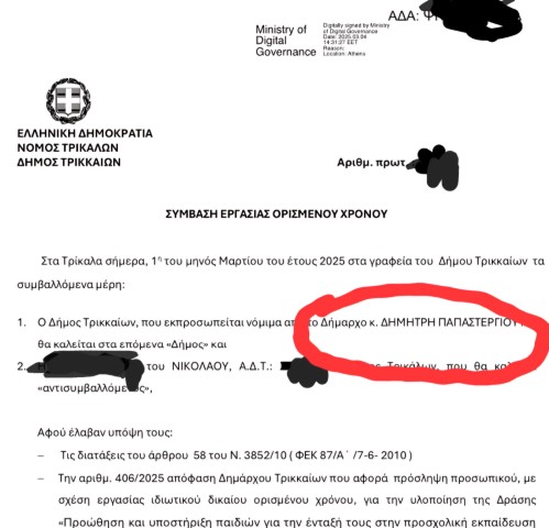 Νεοπροσλαμβανόμενος στον Δήμο Τρικκαίων, μόλις την 1η Μαρτίου, υπέγραψε σύμβαση με τον Δήμο τον οποίο όπως φαίνεται και παραπάνω εκπροσωπεί ο… δήμαρχος Δημήτρης Παπαστεργίου!!!… Προφανώς πρόκειται για γκάφα ολκής. Λίγη προσοχή παιδιά, μη χάσουμε τη μπάλα…