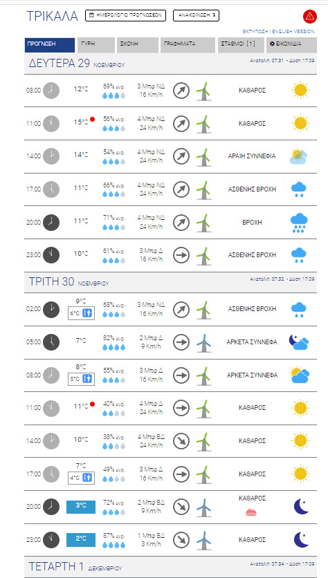 Όπως καταγράφει το trikalavoice.gr η αστάθεια του καιρού θα συνεχιστεί και σήμερα με τοπικά έντονα φαινόμενα και πάλι και τη θερμοκρασία να φτάνει έως 14°C. Ο καιρός φαίνεται να βελτιώνεται από απόψε και μέχρι την Παρασκευή δεν “φαίνονται” νέες βροχοπτώσεις, ωστόσο θα σημειωθεί μικρή πτώση της θερμοκρασίας. Επίσης αναμένεται να συνεχιστούν και οι ομίχλες τις πρωινές και τις βραδινές ώρες. Δείτε την πρόγνωση του επόμενου διημέρου από το meteo.gr: