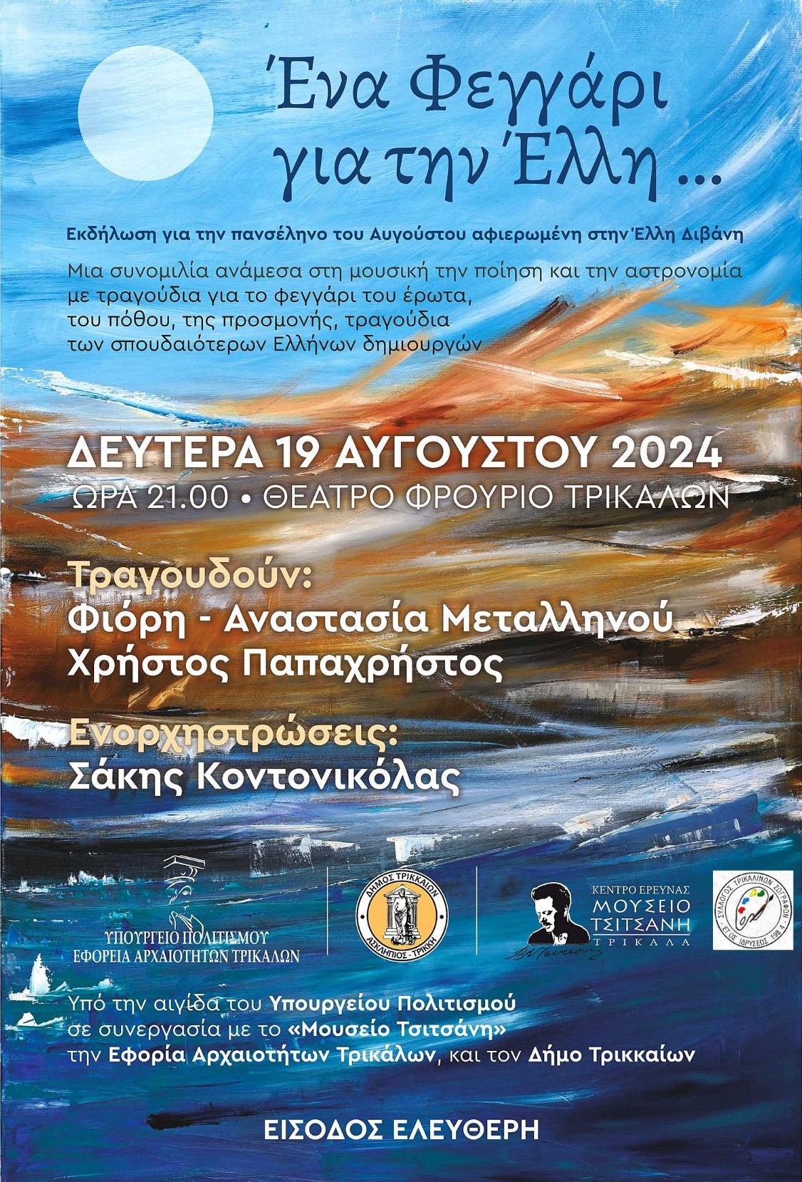 Μουσική εκδήλωση με αφορμή την αυγουστιάτικη πανσέληνο και αφιερωμένη στην Έλλη Διβάνη θα πραγματοποιηθεί τη Δευτέρα 19 Αυγούστου 2024 στις 21:00, στο Υπαίθριο Δημοτικό Θέατρο (Φρούριο) των Τρικάλων, με ελεύθερη είσοδο. Η εκδήλωση υλοποιείται με την υποστήριξη της συμπολίτισσας Σοφίας Διβάνη και οργανώνεται στο πλαίσιο των εκδηλώσεων του Υπουργείου Πολιτισμού για την πανσέληνο, από το «Μουσείο Τσιτσάνη», σε συνεργασία με την Εφορία Αρχαιοτήτων Τρικάλων, τον Δήμο Τρικκαίων και τον Σύλλογο Τρικαλινών Ζωγράφων.
