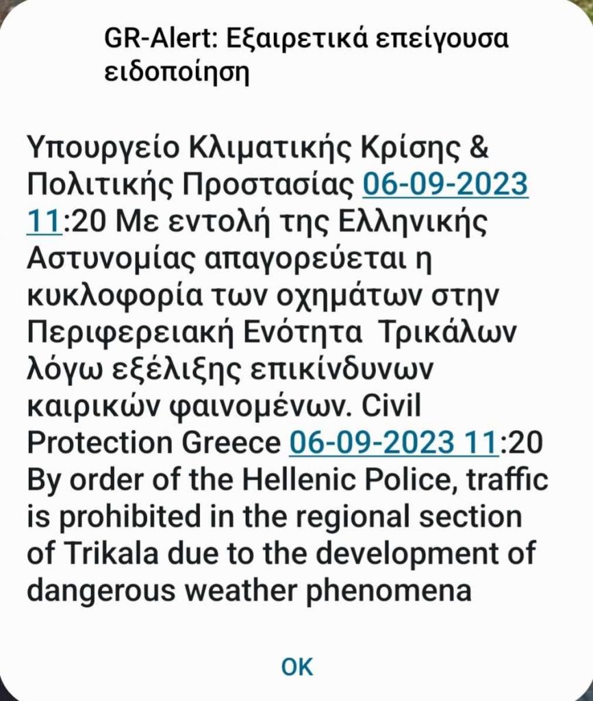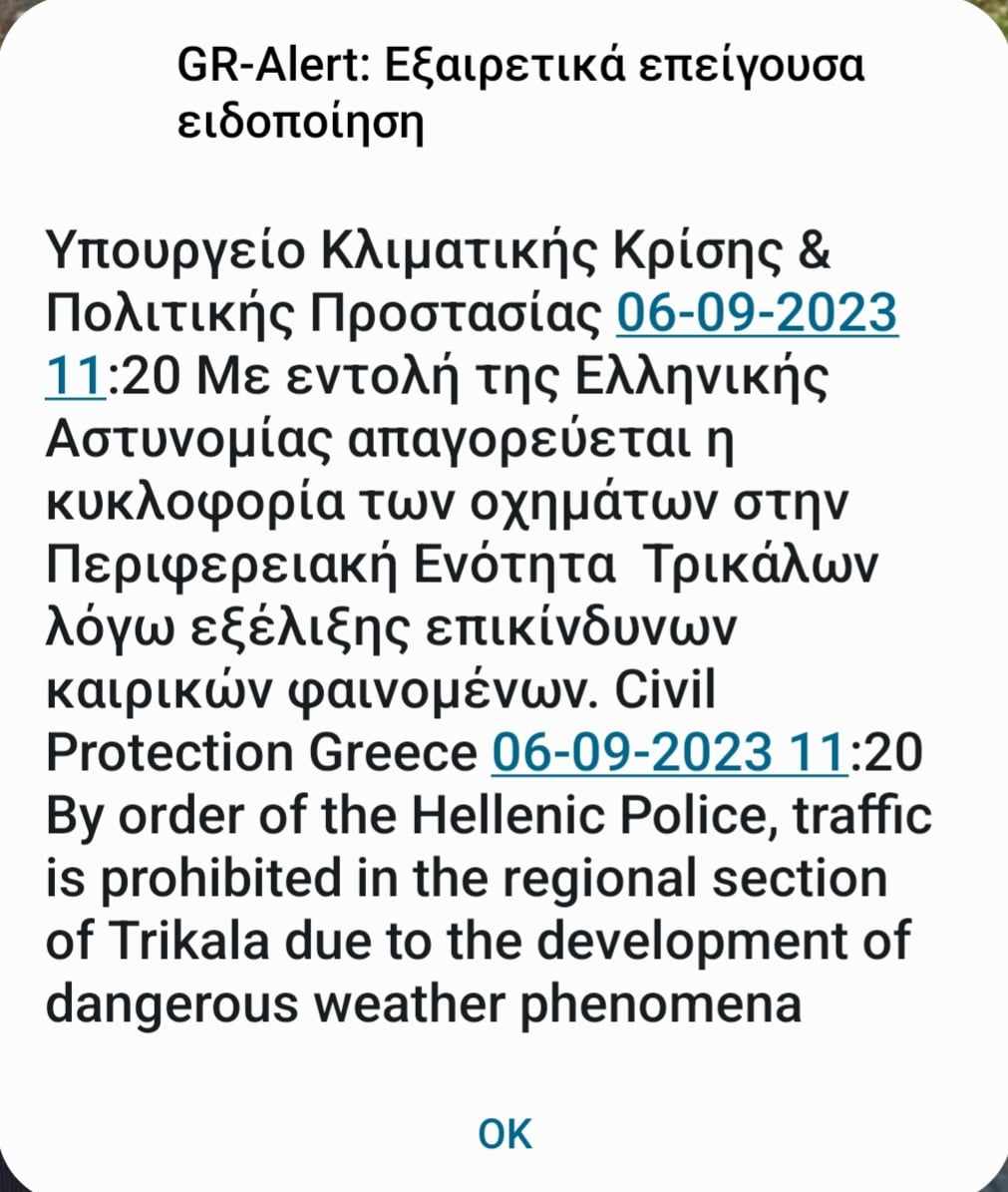 Με έκτακτο μήνυμα της Πολιτικής Προστασίας εφαρμόζεται από τις 11.20 το πρωί ολική απαγόρευση κυκλοφορίας οχημάτων στο ν. Τρικάλων.