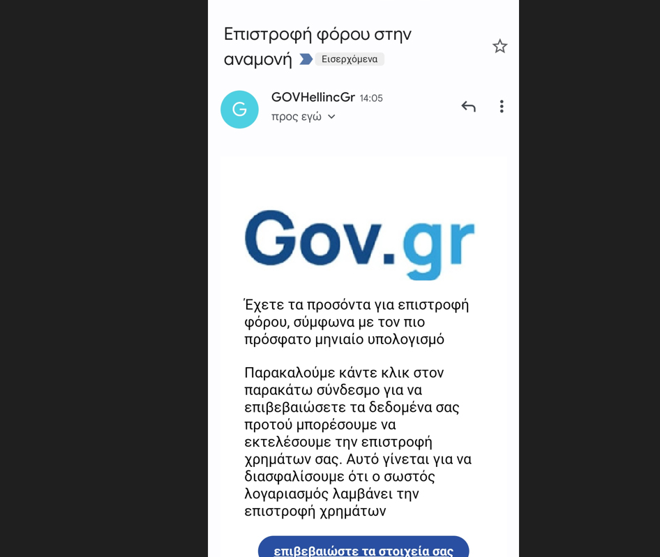 Νέα απόπειρα απάτης σε βάρος Τρικαλινών (… και όχι μόνο). Από το πρωί δέχονται e-mail για… δήθεν επιστροφή φόρων με πλαστογραφημένο το σήμα του “Gov.gr”.