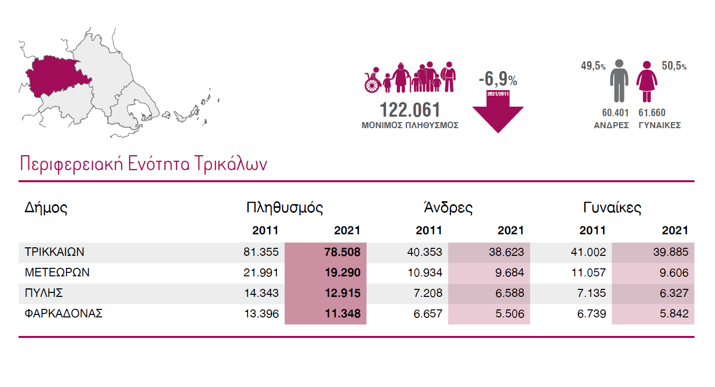 Σύμφωνα με τα επίσημα στοιχεία που παρουσιάζει το trikalavoice.gr παρακάτω ο πληθυσμός σε επίπεδο Νομού μειώθηκε κατά 6.9% σε σχέση με το 2011, καθώς φέτος καταγράφηκαν 122.061 άτομα, εκ των οποίων οι 60.401 άνδρες και οι 61.660 γυναίκες.