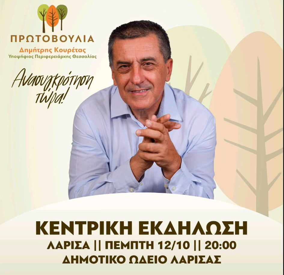 Στην αίθουσα του Δημοτικού Ωδείου Λάρισας πραγματοποιεί απόψε, Πέμπτη, την κεντρική του ομιλία ο υποψήφιος περιφερειάρχης Θεσσαλίας Δημήτρης Κουρέτας.