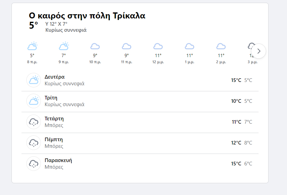Σύμφωνα με τα στοιχεία που συλλέγει το trikalavoice.gr ο Δεκέμβριος μπαίνει με βροχές και αισθητή πτώση της θερμοκρασίας που τις θερμές ώρες της ημέρας δεν θα ξεπερνά τους 15 C. Δείτε την πρόγνωση για την περιοχή μας: