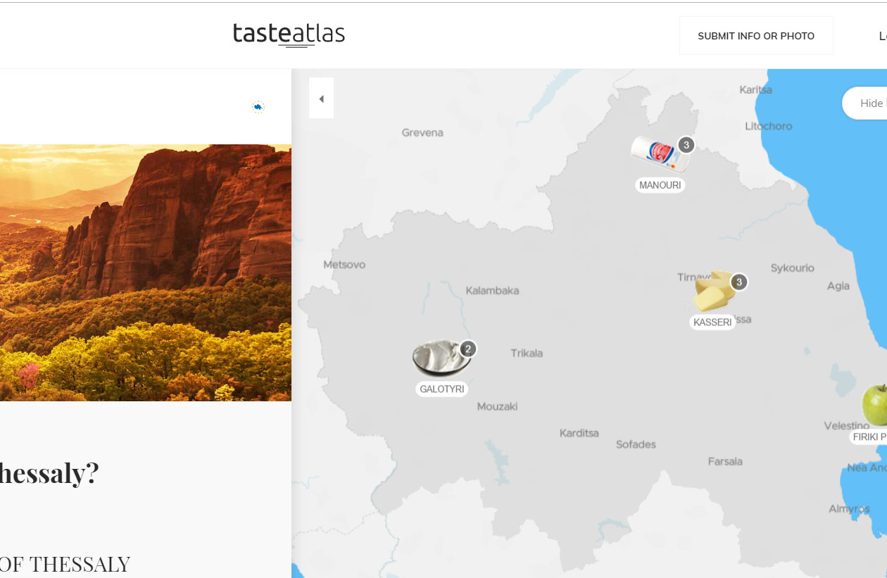 Στην αναζήτηση στο TasteAtlas για την Ελλάδα, βρίσκουμε ελαιόλαδο Θάσου και μπουγάτσα Θεσσαλονίκης, η Νάουσα έχει ως σήμα της το κρασί, η Aράχωβα τη φορμαέλα και η Αθήνα τη φέτα.